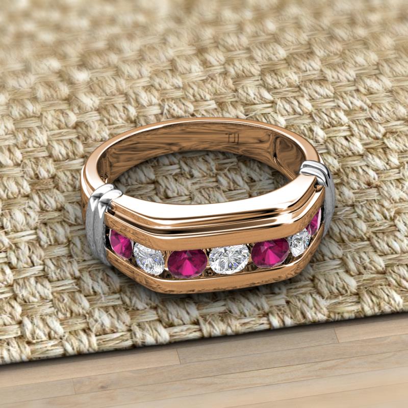 Presenting Rhodolite Garnet and Lab Grown Diamond Channel set Men Wedding Ring in 18K Rose Gold with White Bars on the side to give Two Tone look. The White Bar on the side is White plated on 18K Rose Gold, it could wear off with time.