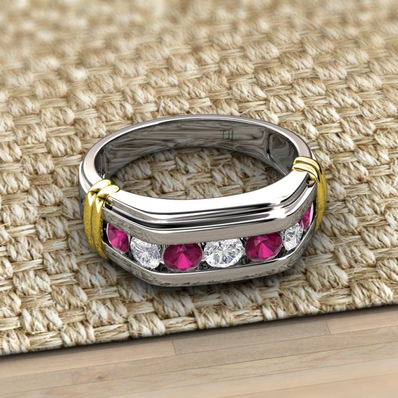 Presenting Rhodolite Garnet and Lab Grown Diamond Channel set Men Wedding Ring in Platinum with Yellow Bars on the side to give Two Tone look. The Yellow Bar on the side is Yellow plated on Platinum, it could wear off with time.
