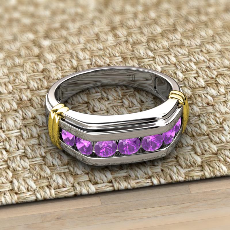 Presenting Amethyst Channel set Men Wedding Ring in Sterling Silver with Yellow Bars on the side to give Two Tone look. The Yellow Bar on the side is Yellow plated on Sterling Silver, it could wear off with time.