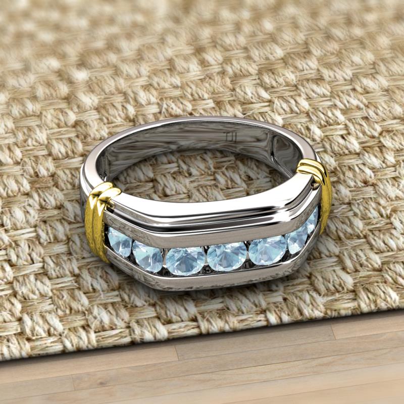 Presenting Aquamarine Channel set Men Wedding Ring in Sterling Silver with Yellow Bars on the side to give Two Tone look. The Yellow Bar on the side is Yellow plated on Sterling Silver, it could wear off with time.