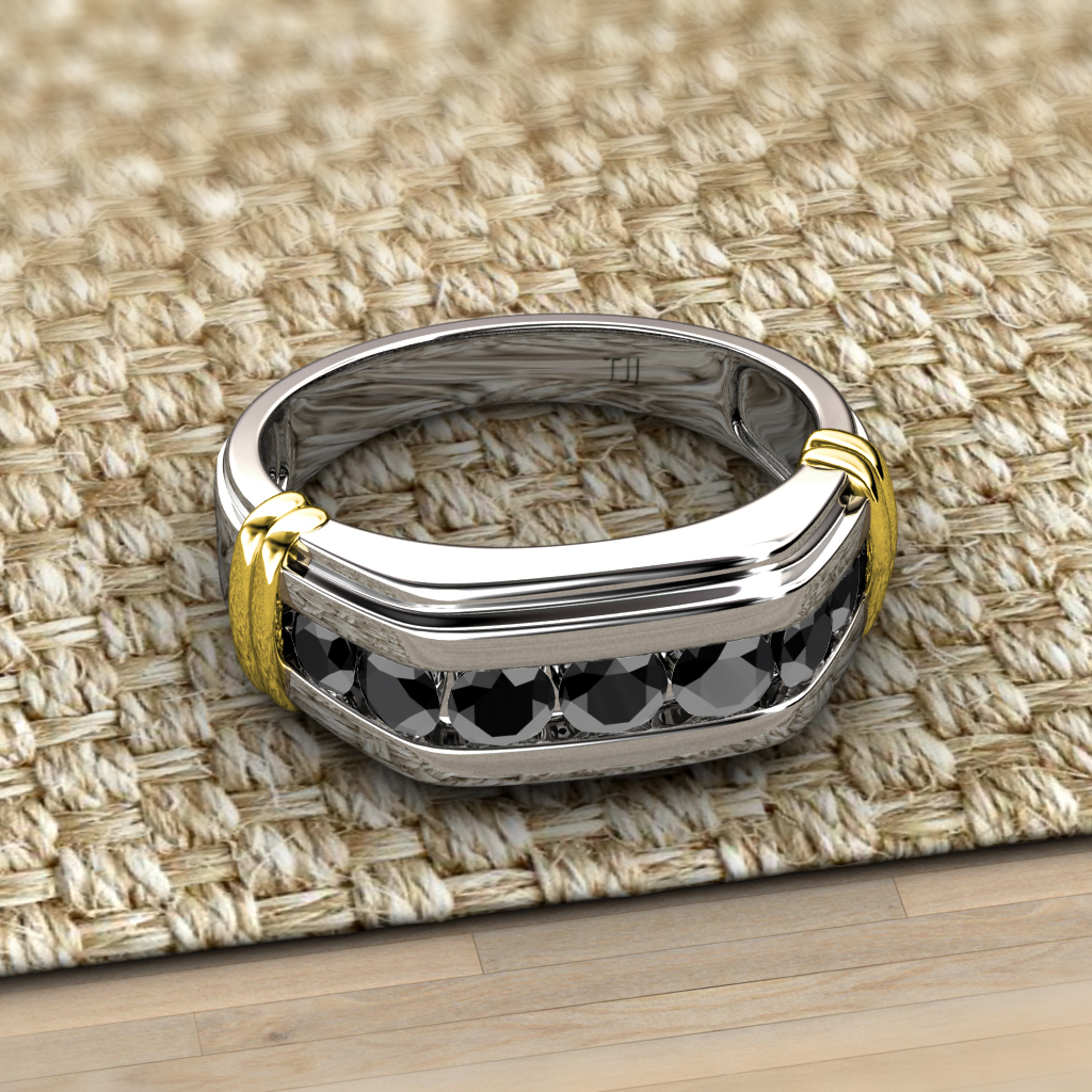 Presenting Black Diamond Channel set Men Wedding Ring in 18K White Gold with Yellow Bars on the side to give Two Tone look. The Yellow Bar on the side is Yellow plated on 18K White Gold, it could wear off with time.