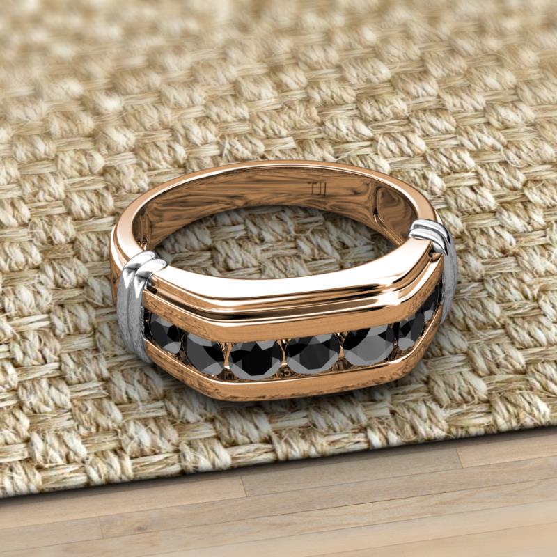 Presenting Black Diamond Channel set Men Wedding Ring in 18K Rose Gold with White Bars on the side to give Two Tone look. The White Bar on the side is White plated on 18K Rose Gold, it could wear off with time.