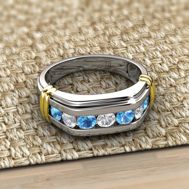 Presenting Blue Topaz and Diamond Channel set Men Wedding Ring in Platinum with Yellow Bars on the side to give Two Tone look. The Yellow Bar on the side is Yellow plated on Platinum, it could wear off with time.