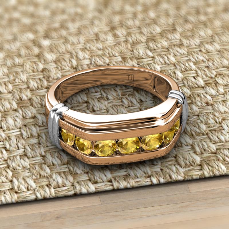 Presenting Citrine Channel set Men Wedding Ring in 14K Rose Gold with White Bars on the side to give Two Tone look. The White Bar on the side is White plated on 14K Rose Gold, it could wear off with time.