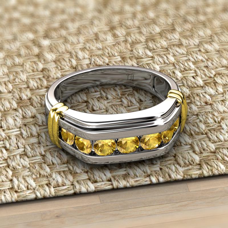 Presenting Citrine Channel set Men Wedding Ring in Sterling Silver with Yellow Bars on the side to give Two Tone look. The Yellow Bar on the side is Yellow plated on Sterling Silver, it could wear off with time.