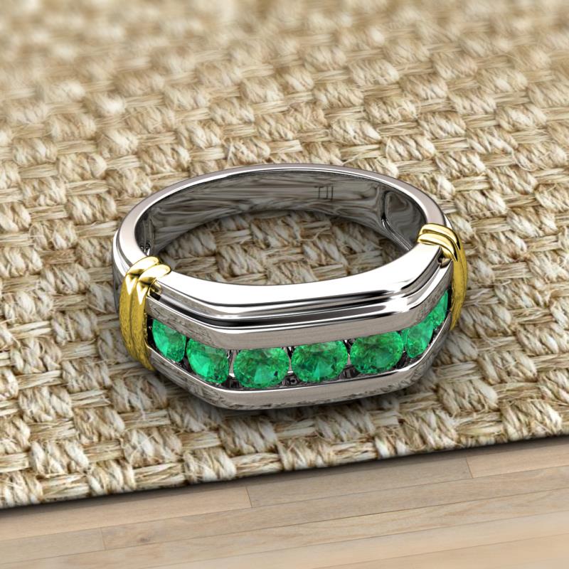 Presenting Emerald Channel set Men Wedding Ring in Sterling Silver with Yellow Bars on the side to give Two Tone look. The Yellow Bar on the side is Yellow plated on Sterling Silver, it could wear off with time.