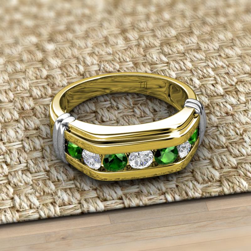 Presenting Green Garnet and Diamond Channel set Men Wedding Ring in 18K Yellow Gold with White Bars on the side to give Two Tone look. The White Bar on the side is White plated on 18K Yellow Gold, it could wear off with time.
