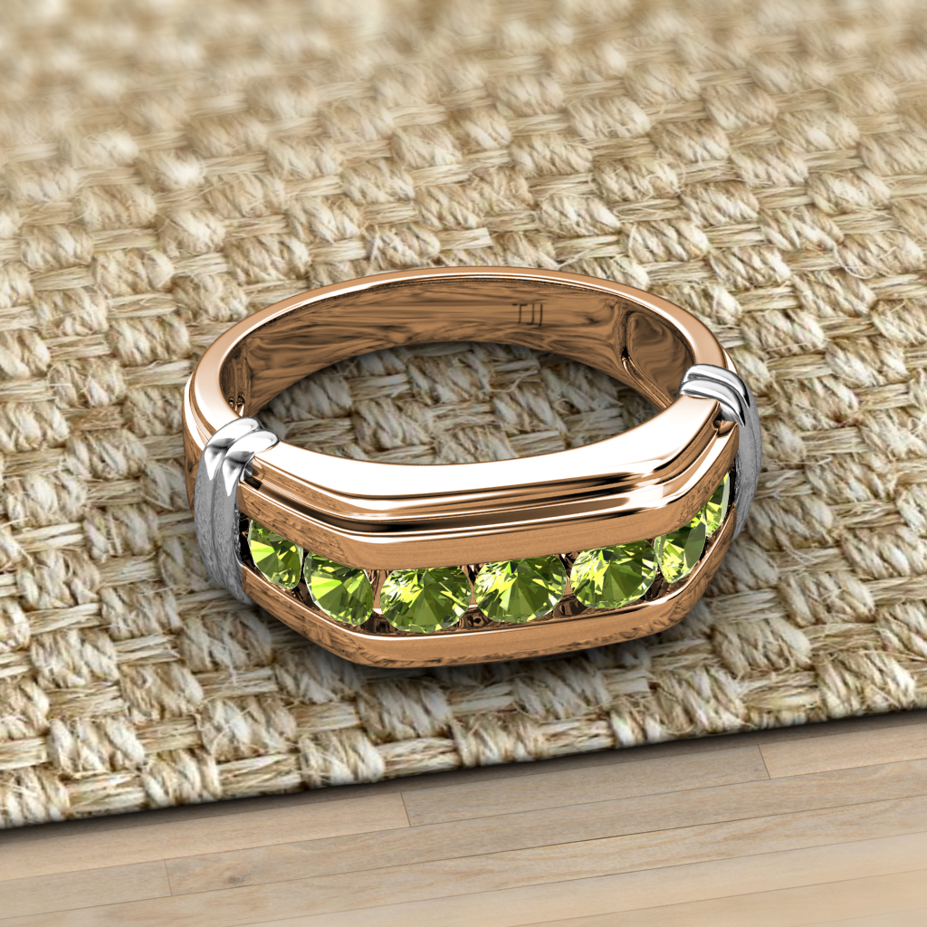 Presenting Peridot Channel set Men Wedding Ring in 10K Rose Gold with White Bars on the side to give Two Tone look. The White Bar on the side is White plated on 10K Rose Gold, it could wear off with time.