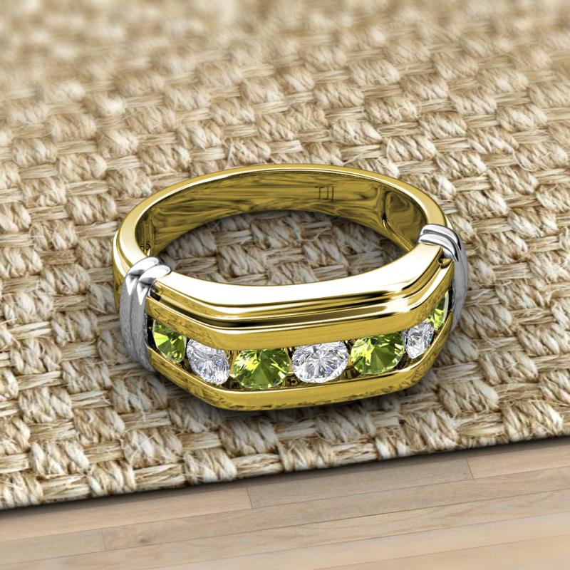 Presenting Peridot and Diamond Channel set Men Wedding Ring in 18K Yellow Gold with White Bars on the side to give Two Tone look. The White Bar on the side is White plated on 18K Yellow Gold, it could wear off with time.