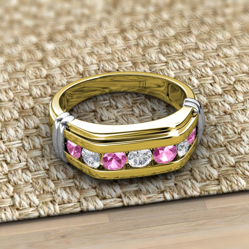Presenting Pink Sapphire and Diamond Channel set Men Wedding Ring in 18K Yellow Gold with White Bars on the side to give Two Tone look. The White Bar on the side is White plated on 18K Yellow Gold, it could wear off with time.