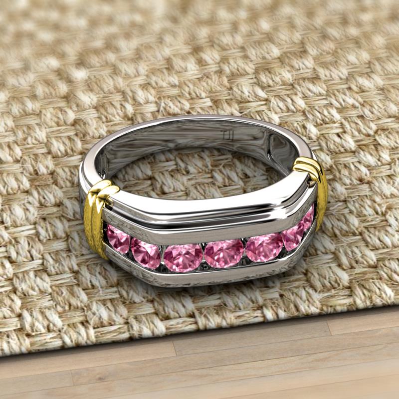 Presenting Pink Tourmaline Channel set Men Wedding Ring in 10K White Gold with Yellow Bars on the side to give Two Tone look. The Yellow Bar on the side is Yellow plated on 10K White Gold, it could wear off with time.