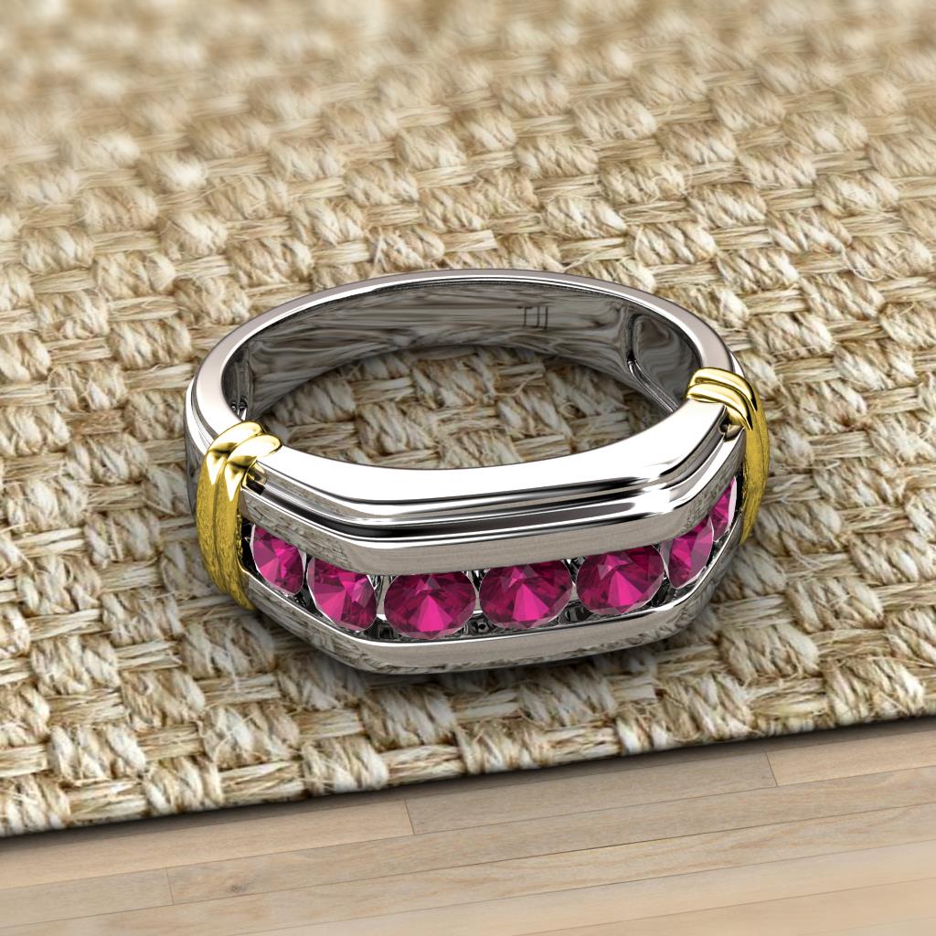 Presenting Rhodolite Garnet Channel set Men Wedding Ring in 10K White Gold with Yellow Bars on the side to give Two Tone look. The Yellow Bar on the side is Yellow plated on 10K White Gold, it could wear off with time.