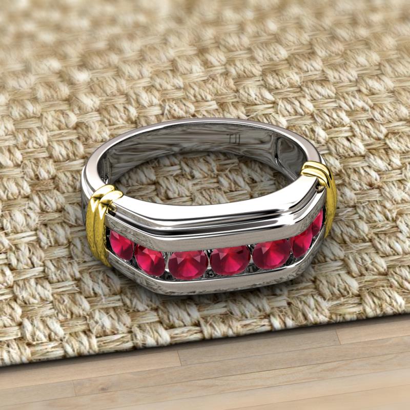 Presenting Ruby Channel set Men Wedding Ring in 14K White Gold with Yellow Bars on the side to give Two Tone look. The Yellow Bar on the side is Yellow plated on 14K White Gold, it could wear off with time.