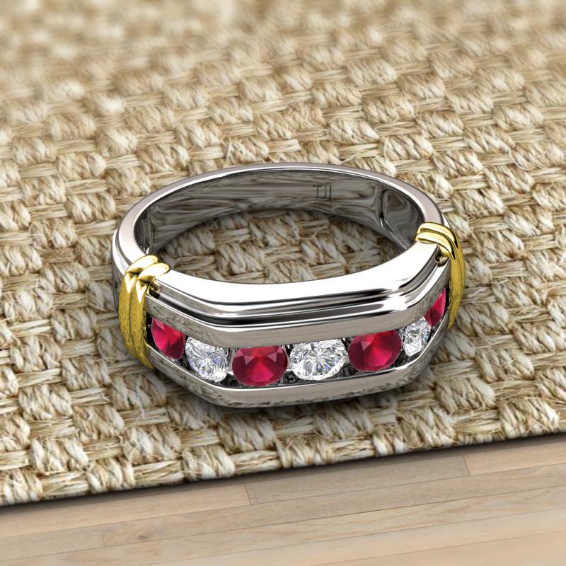Presenting Ruby and Diamond Channel set Men Wedding Ring in Platinum with Yellow Bars on the side to give Two Tone look. The Yellow Bar on the side is Yellow plated on Platinum, it could wear off with time.