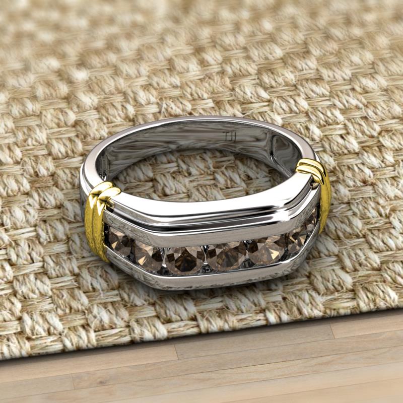 Presenting Smoky Quartz Channel set Men Wedding Ring in 10K White Gold with Yellow Bars on the side to give Two Tone look. The Yellow Bar on the side is Yellow plated on 10K White Gold, it could wear off with time.