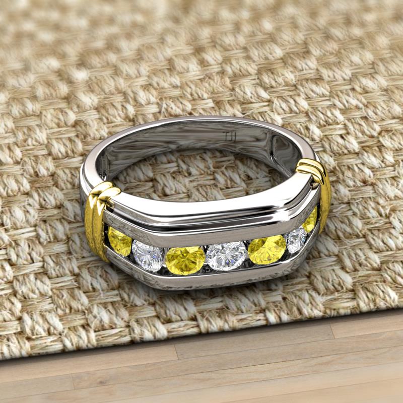 Presenting Yellow Sapphire and Diamond Channel set Men Wedding Ring in Platinum with Yellow Bars on the side to give Two Tone look. The Yellow Bar on the side is Yellow plated on Platinum, it could wear off with time.
