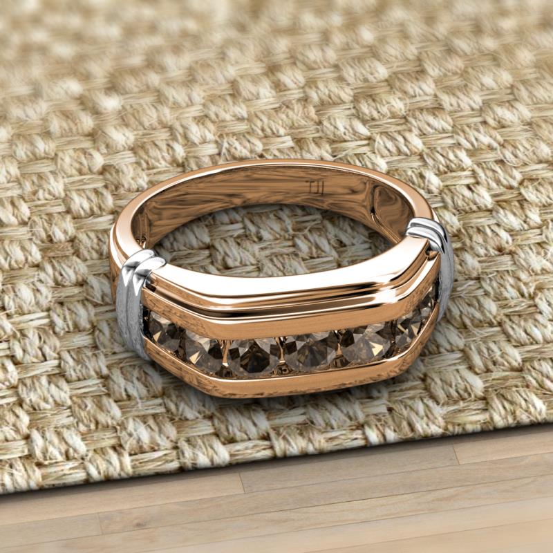 Presenting Smoky Quartz and Lab Grown Diamond Channel set Men Wedding Ring in 10K Rose Gold with White Bars on the side to give Two Tone look. The White Bar on the side is White plated on 10K Rose Gold, it could wear off with time.