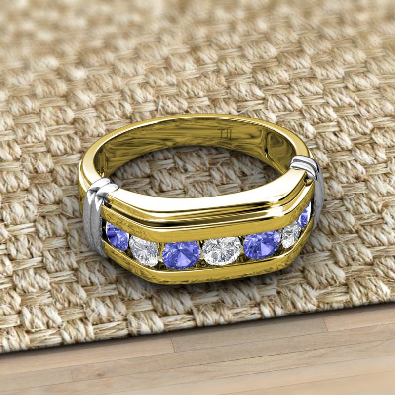Presenting Tanzanite and Lab Grown Diamond Channel set Men Wedding Ring in 14K Yellow Gold with White Bars on the side to give Two Tone look. The White Bar on the side is White plated on 14K Yellow Gold, it could wear off with time.