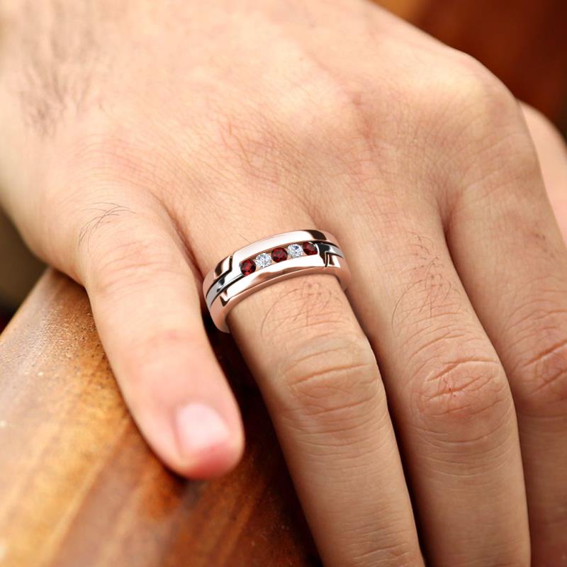 Enhance your daily look with this exquisite men's band, featuring a strong and stable design with five dazzling combination Red Garnet and Lab Grown Diamonds. Crafted in 10K Rose Gold.