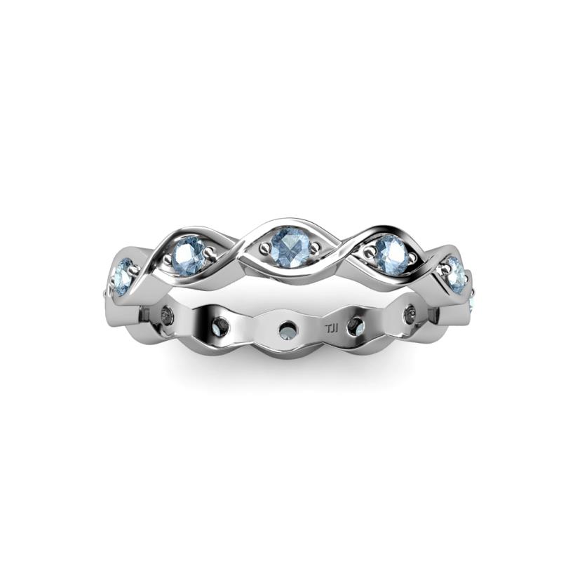 This fascinating 0.30 Carat tw-0.33 Carat tw Twisted Eternity Band will capture your attention with exciting Aquamarine which are Prong Set in an Eternity style going all the way around your finger. *As per ring size the stone and carat total weight changes.