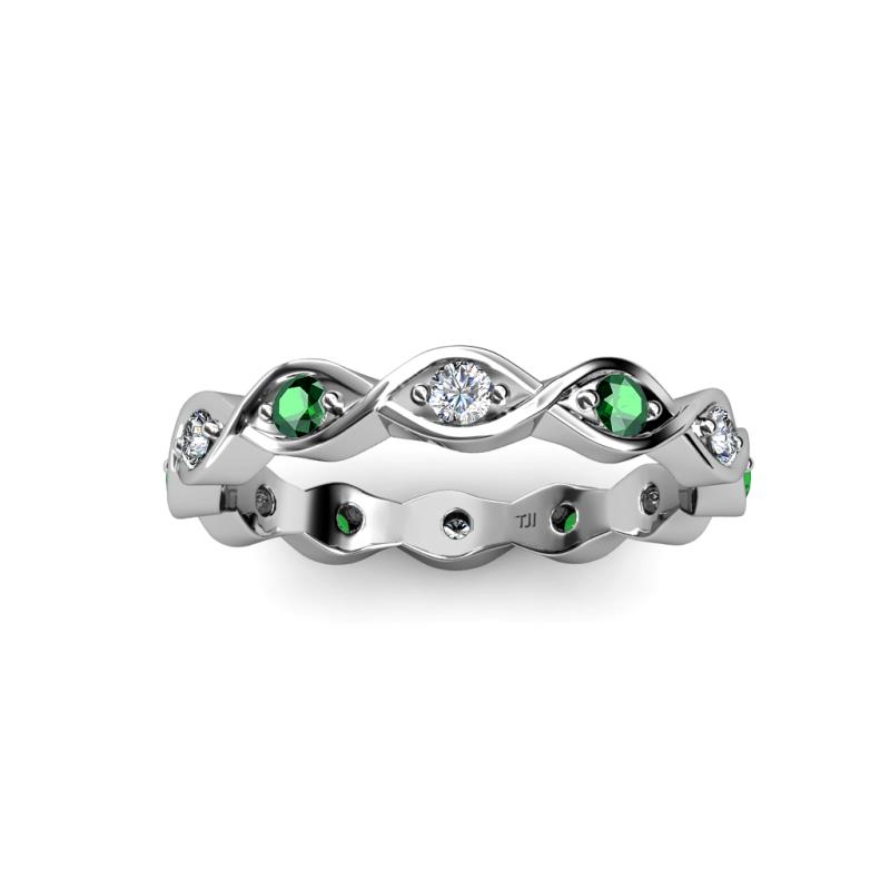 This fascinating 0.20 Carat tw-0.22 Carat tw Twisted Eternity Band will capture your attention with exciting Emerald and Diamond which are Prong Set in an Eternity style going all the way around your finger. *As per ring size the stone and carat total weight changes.