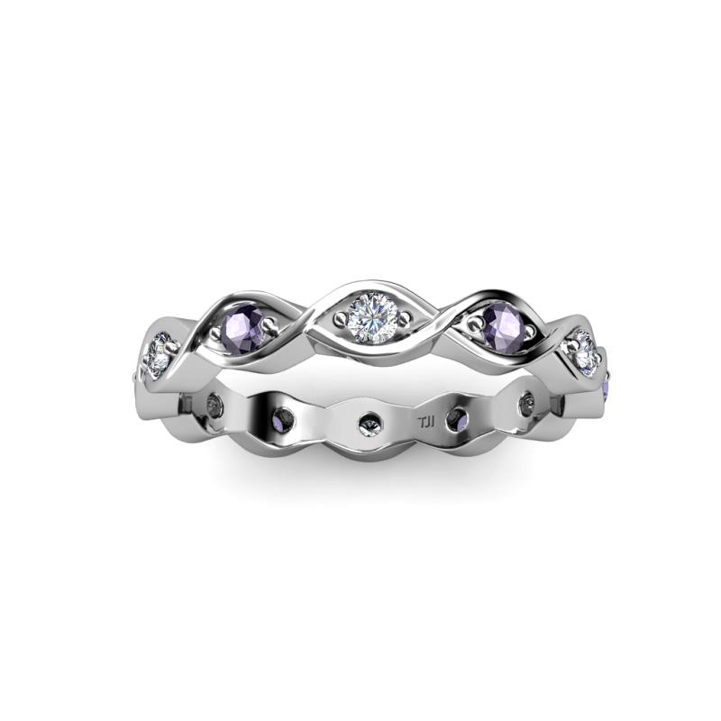 This fascinating Twisted Eternity Band will capture your attention with exciting Iolite and Lab Grown Diamond which are Prong Set in an Eternity style going all the way around your finger. *As per ring size the stone and carat total weight changes.