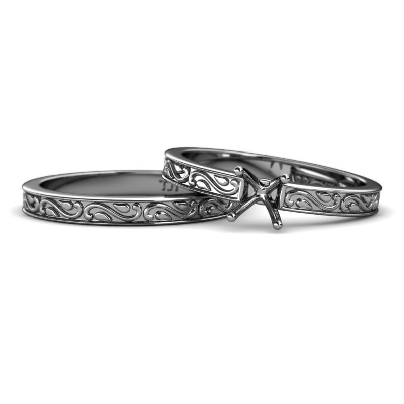 This exquisite Semi Mount Solitaire Engagement Ring is adorned with motif of engraved scroll pattern around the shank accompanied by a matching Wedding Band.