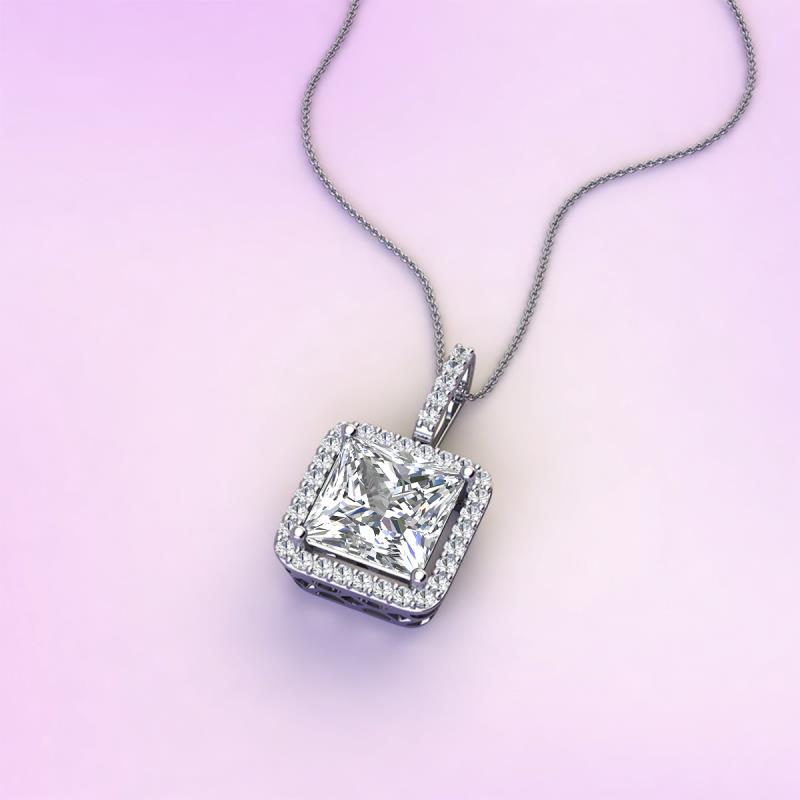 Radiating a luxurious aura, this diamond halo pendant with Princess Cut Forever Brilliant Moissanite set within a halo of shimmering diamonds is the perfect way to add a touch of elegance to any ensemble.