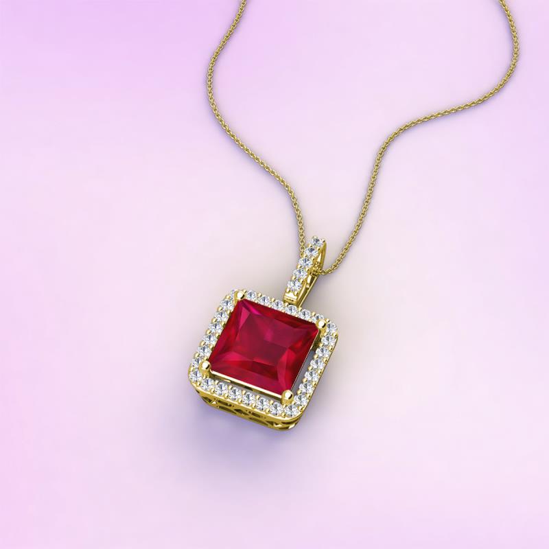 Princess Cut Lab Created Ruby and Round Diamond 2.23 ctw Womens Halo Pendant Necklace 14K Yellow Gold. Included 16 Inches 14K Yellow Gold Cha More Details ...