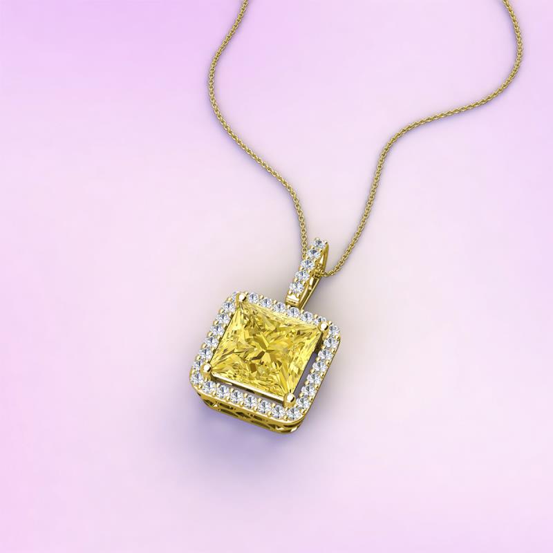 Radiating a luxurious aura, this diamond halo pendant with Princess Cut Lab Created Yellow Sapphire set within a halo of shimmering diamonds is the perfect way to add a touch of elegance to any ensemble.