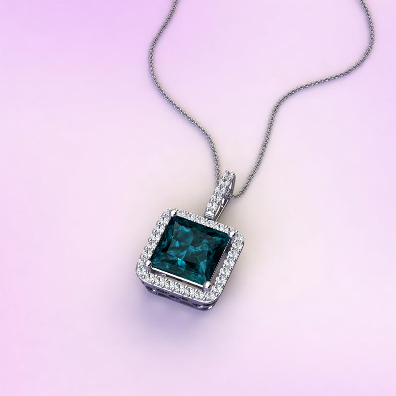 Radiating a luxurious aura, this diamond halo pendant with princess cut London Blue Topaz set within a halo of shimmering diamonds is the perfect way to add a touch of elegance to any ensemble.