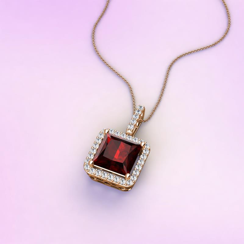 Radiating a luxurious aura, this diamond halo pendant with princess cut Red Garnet set within a halo of shimmering diamonds is the perfect way to add a touch of elegance to any ensemble.
