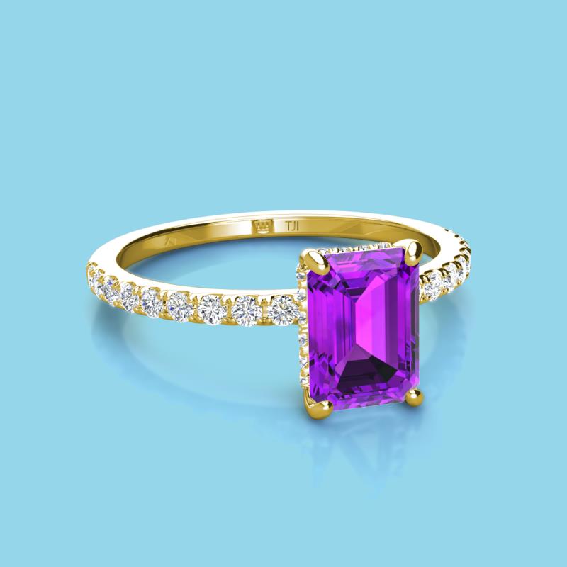 This Ring is sure to impress with hidden halo of Diamond that wraps around the Center Emerald Cut Amethyst. The Diamond on the band adds extra sparkle to it.