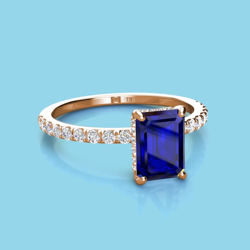 This Ring is sure to impress with hidden halo of Diamond that wraps around the Center Emerald Cut Blue Sapphire. The Diamond on the band adds extra sparkle to it.