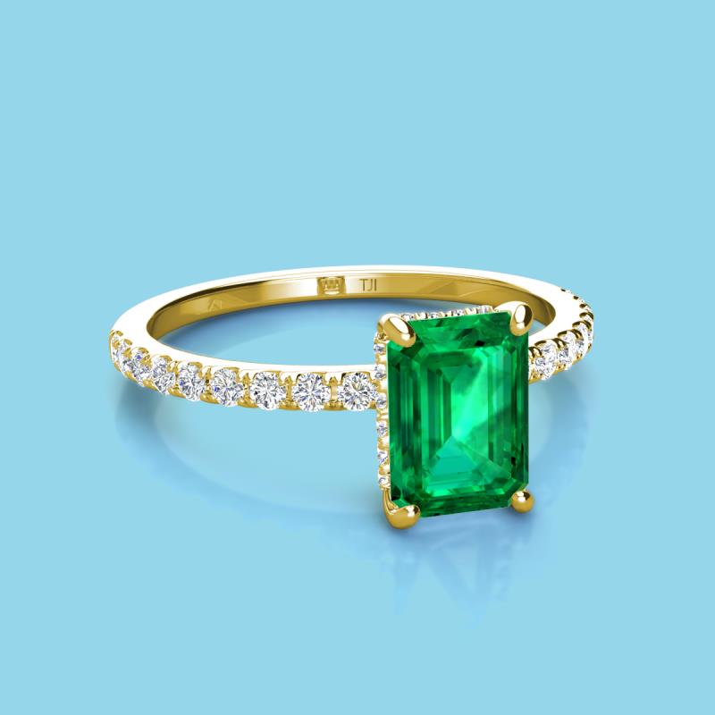 This Ring is sure to impress with hidden halo of Diamond that wraps around the Center Emerald Cut Emerald. The Diamond on the band adds extra sparkle to it.
