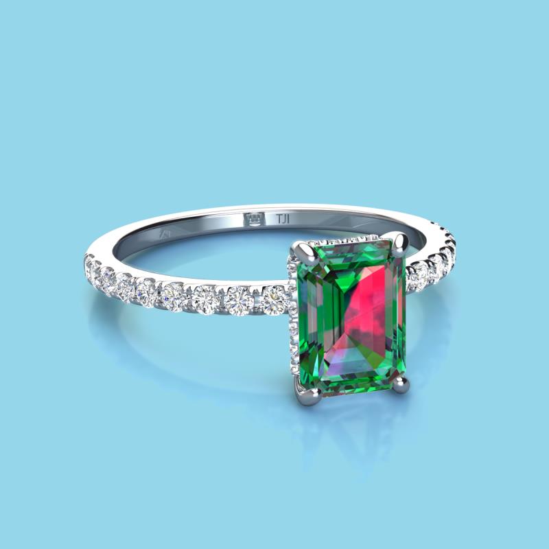 This Ring is sure to impress with hidden halo of Diamond that wraps around the Center Emerald Cut Lab Created Alexandrite. The Diamond on the band adds extra sparkle to it.