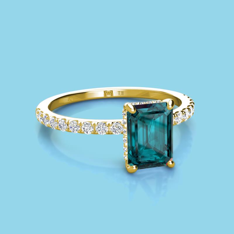 This Ring is sure to impress with hidden halo of Diamond that wraps around the Center Emerald Cut London Blue Topaz. The Diamond on the band adds extra sparkle to it.