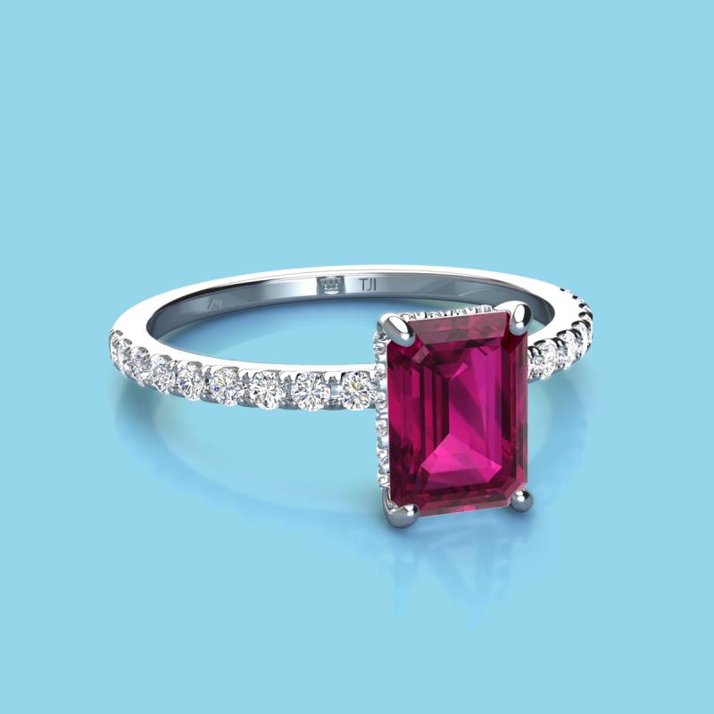 This Ring is sure to impress with hidden halo of Diamond that wraps around the Center Emerald Cut Rhodolite Garnet. The Diamond on the band adds extra sparkle to it.