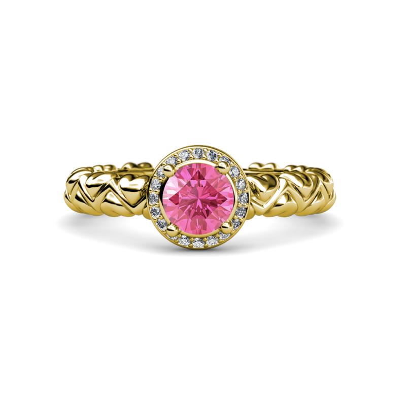Let your Ring do the talking with Center Pink Tourmaline hugged by glittering halo of Diamonds with cascading alternating heart design shank and beautiful bridge undergallery design giving it a vintage look.