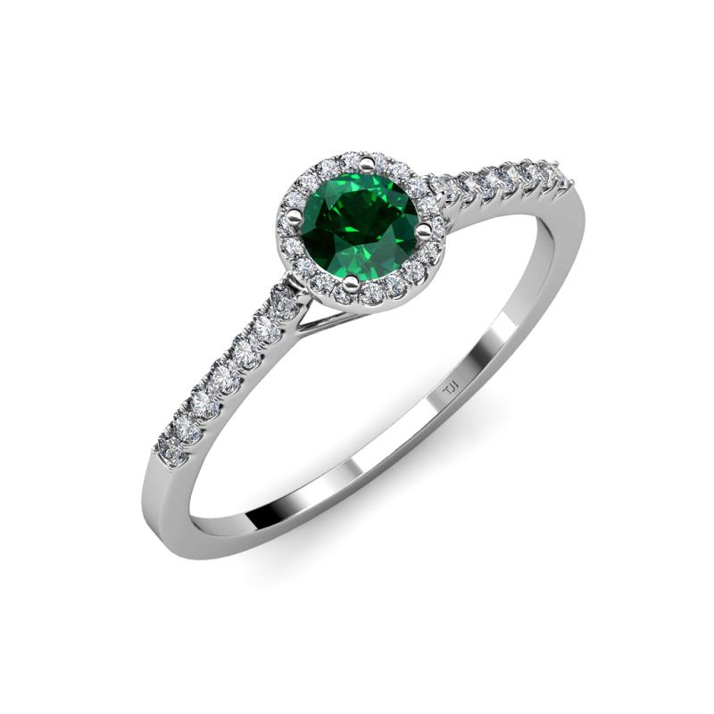 Express your desire to Grow old with her with this 0.95 ct tw Halo Engagement Ring with Center Emerald embraced by halo of Diamonds which adds beauty to it.