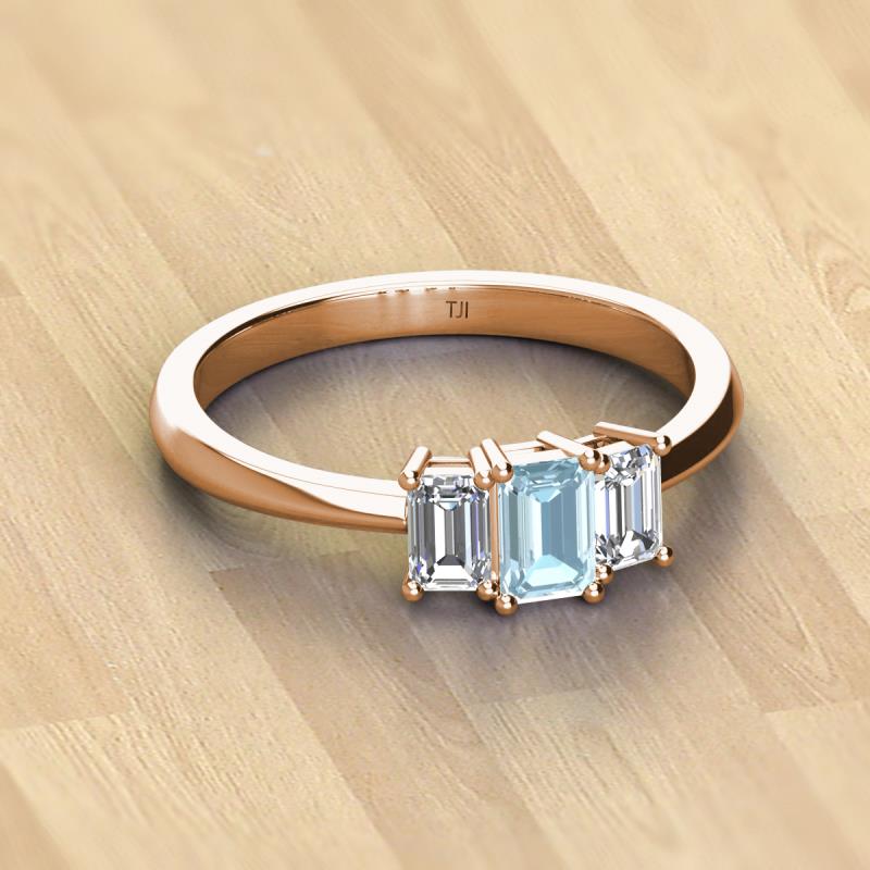 It's hard not to stare at this three stone engagement ring. Two Emerald-cut Lab Grown Diamond sit on either side of a jaw-dropping Emerald-cut Aquamarine set in 18K Rose Gold. The shared prong settings with side gallery work completes its overall luxurious look.