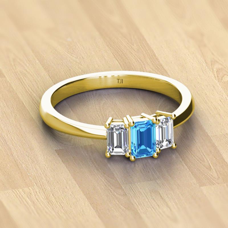 It's hard not to stare at this three stone engagement ring. Two Emerald-cut Lab Grown Diamond sit on either side of a jaw-dropping Emerald-cut Blue Topaz set in 14K Yellow Gold. The shared prong settings with side gallery work completes its overall luxurious look.
