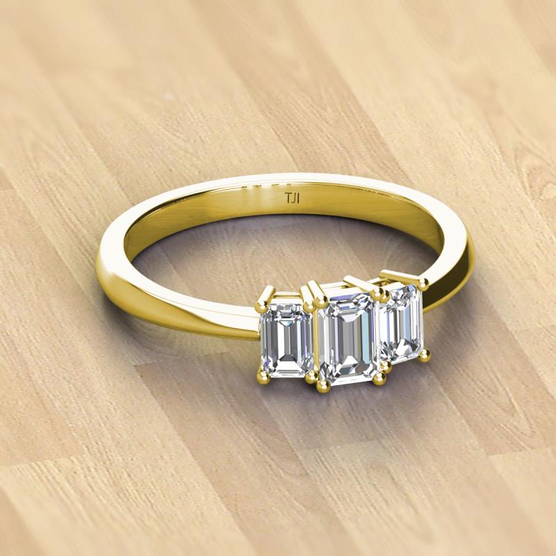 It's hard not to stare at this three stone engagement ring. Two Emerald-cut Lab Grown Diamond sit on either side of a jaw-dropping Emerald-cut Forever Brilliant Moissanite set in 18K Yellow Gold. The shared prong settings with side gallery work completes its overall luxurious look.