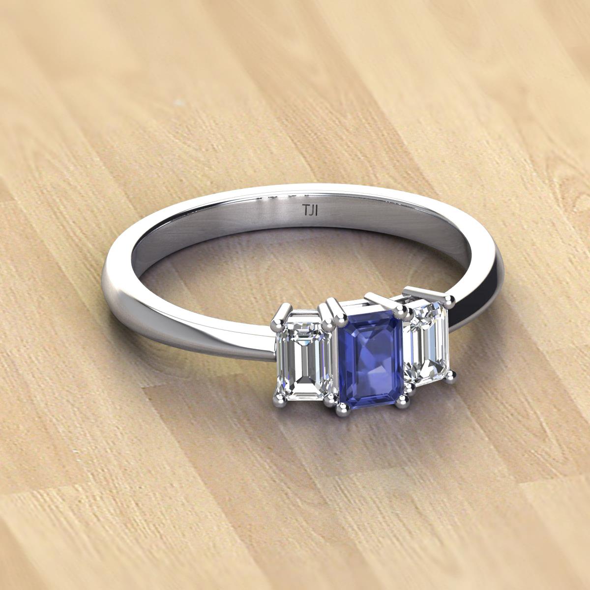 Emerald Cut (6x4 mm) Iolite and Lab Grown Diamond 1.20 ctw Side Gallery Work Three Stone Engagement Ring Platinum More Details ...