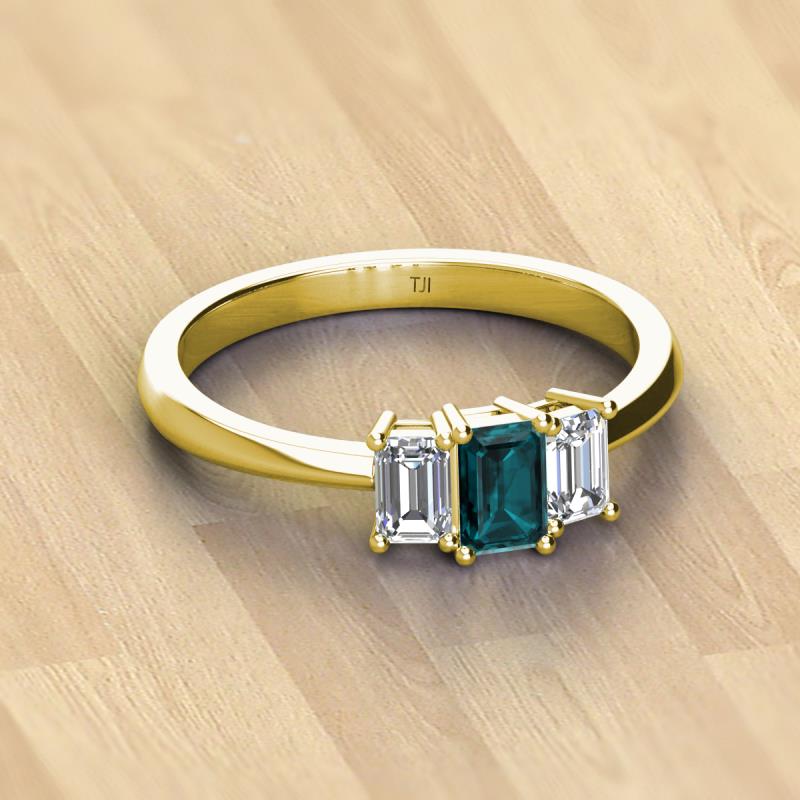 Emerald Cut (6x4 mm) London Blue Topaz and Diamond 1.35 ctw Side Gallery Work Three Stone Engagement Ring 18K Yellow Gold More Details ...