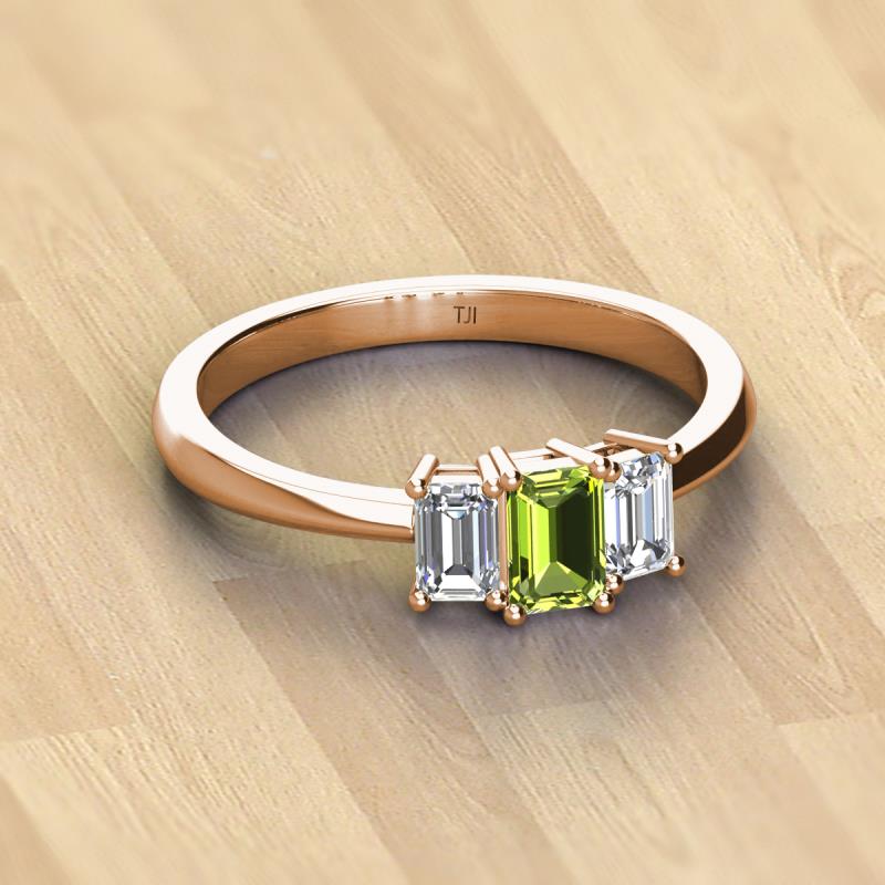 It's hard not to stare at this three stone engagement ring. Two Emerald-cut Lab Grown Diamond sit on either side of a jaw-dropping Emerald-cut Peridot set in 18K Rose Gold. The shared prong settings with side gallery work completes its overall luxurious look.