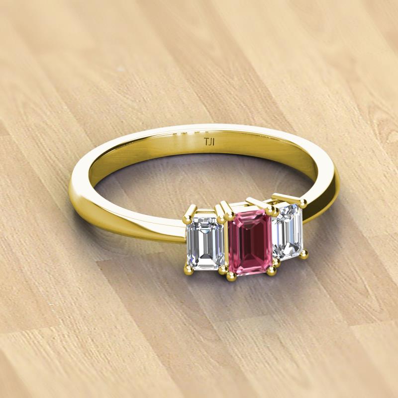 Emerald Cut (6x4 mm) Pink Tourmaline and Diamond 1.30 ctw Side Gallery Work Three Stone Engagement Ring 14K Yellow Gold More Details ...