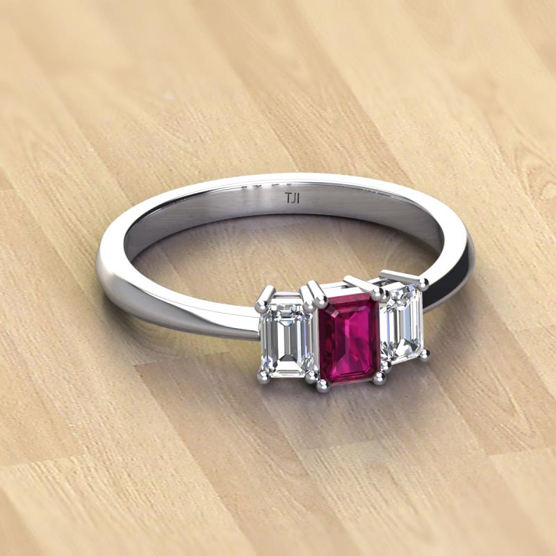 Emerald Cut (6x4 mm) Rhodolite Garnet and Lab Grown Diamond 1.38 ctw Side Gallery Work Three Stone Engagement Ring Platinum More Details ...