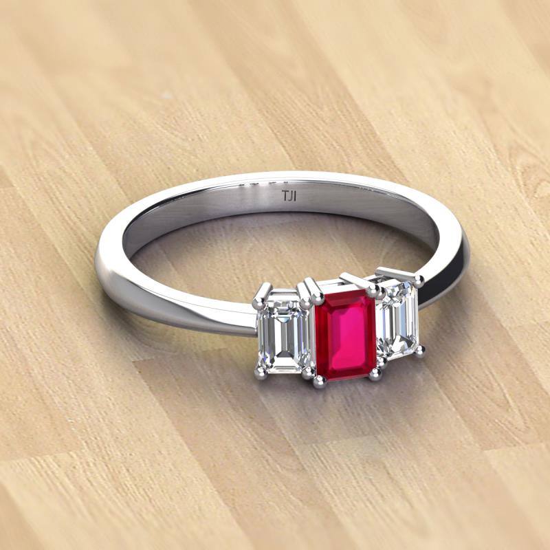 Emerald Cut (6x4 mm) Ruby and Diamond 1.35 ctw Side Gallery Work Three Stone Engagement Ring Platinum More Details ...