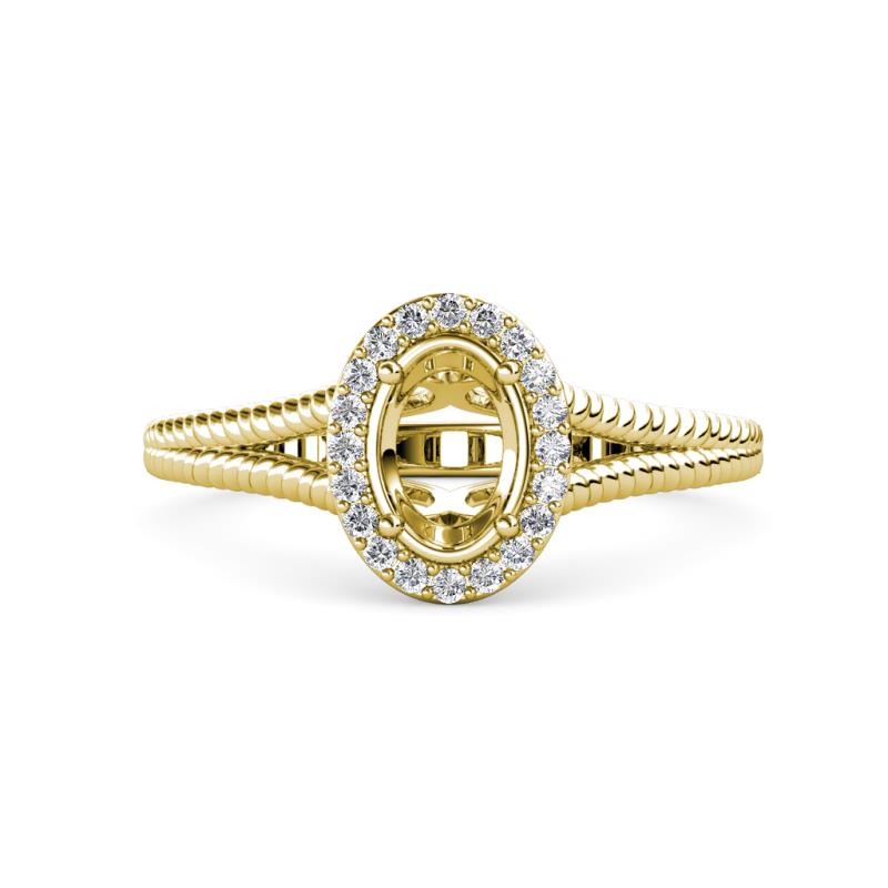 This Oval Shape Semi Mount Engagement Ring adorned by Diamond accents on halo with intricate twist rope detailing on the split shank giving it a distinctive look.
